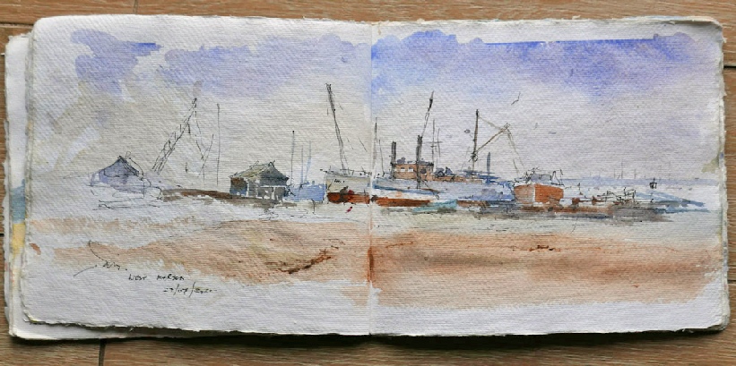 Pen and watercolour sketch in a slightly battered Khadi sketchbook at West Mersea, Essex. Khadi is an Indian handmade paper and these sketchbooks are beautiful to paint on..